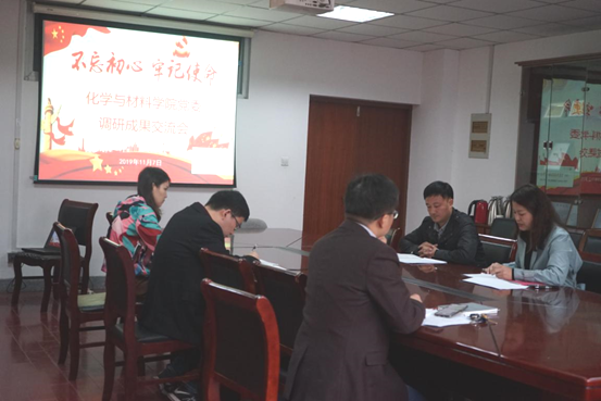 近日,化学与材料学院党委“不忘初心、牢记使命”主题教育专题调研成果交流会在逸夫楼会议室召开。学院领导班子成员出席会议,各党支部书记列席会议。