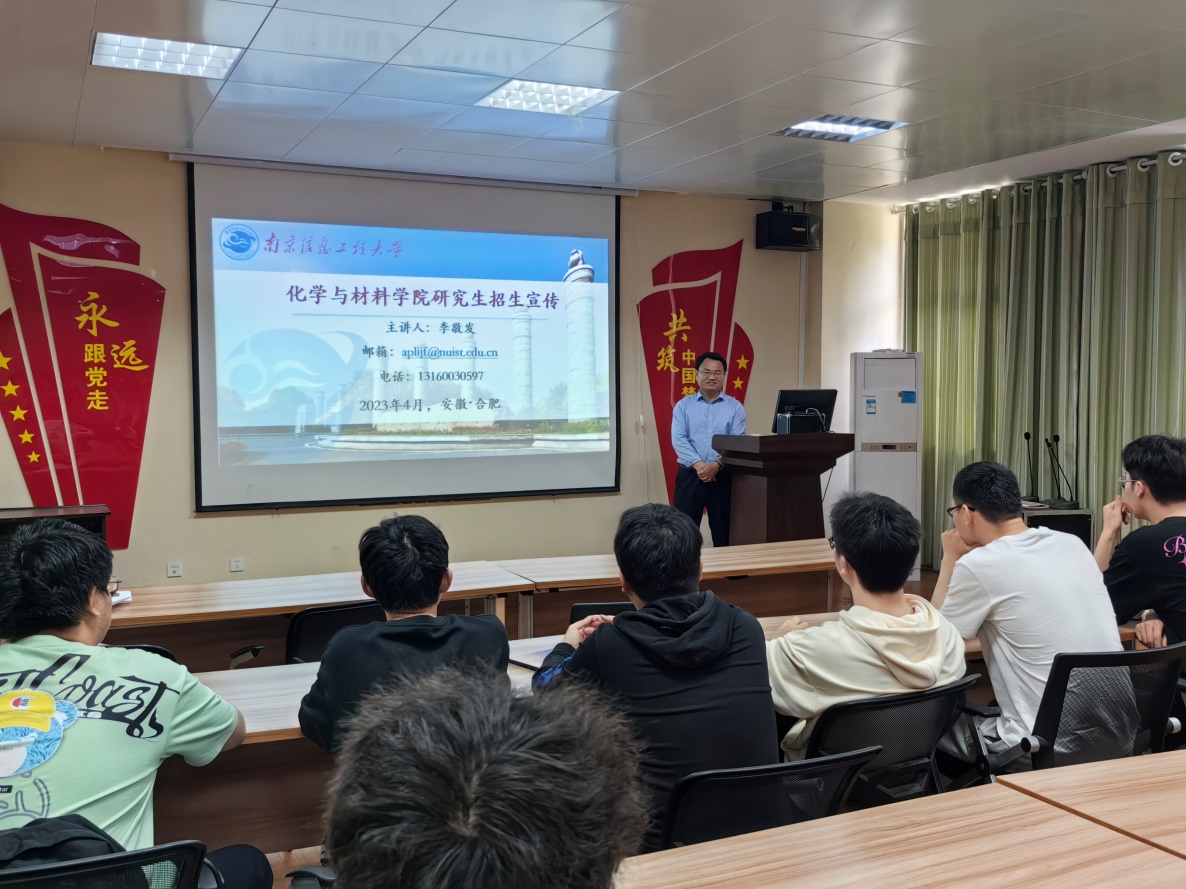 19日晚,耿东生、李敬发又受邀分别为安徽农业大学轻纺工程与艺术学院师生做学术讲座和研究生招生宣讲。优秀研究生代表、本科就读于安徽农业大学的刘红敏同学分享了在南信大化材院求学的历程和自己取得的优异成果,学生们通过聆听报告,加深了对南信大化材院的了解,纷纷表示非常愿意报考南信大化材院。