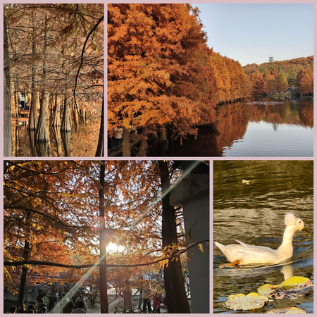 走入钟山水杉林,仿佛步入一幅浓郁的油画。焦糖色的水杉挺拔而立,倒映在清澈的湖水中,光影摇曳,秋意斑斓。同学们徜徉其间,或驻足拍摄,或拾叶为签,或合影留念,青春的身影为这片静谧的林间增添了无限生机与活力。