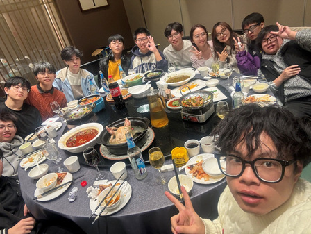 活动尾声,同学们围坐一堂,共享富有乡土风味的午餐。餐桌上热气氤氲,笑语不断。有人津津有味地品尝菜肴,有人主动分享途中抓拍的精彩瞬间,也有人回顾趣事、笑声连连。班长举杯向同学们致以简短的感谢,真挚的祝福引来阵阵碰杯与欢呼。这一刻,温暖与默契在餐桌上静静流淌。