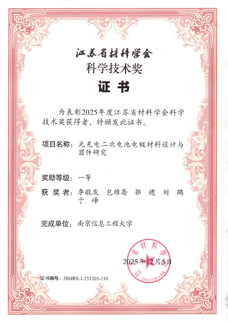 近日,江苏省材料学会第一届理事会第五次(扩大)会议在南京举行。大会发布了2025年度学会“科学技术奖”等项目的获奖名单,并举办颁奖仪式,激励广大会员勇攀科技高峰。化学与材料学院李敬发教授主持的《光充电二次电池电极材料设计与器件研究(基础研究)》项目荣获2025年度江苏省材料学会科学技术一等奖(完成人:李敬发、包维斋、郭璁、刘鹤、于峰)。
